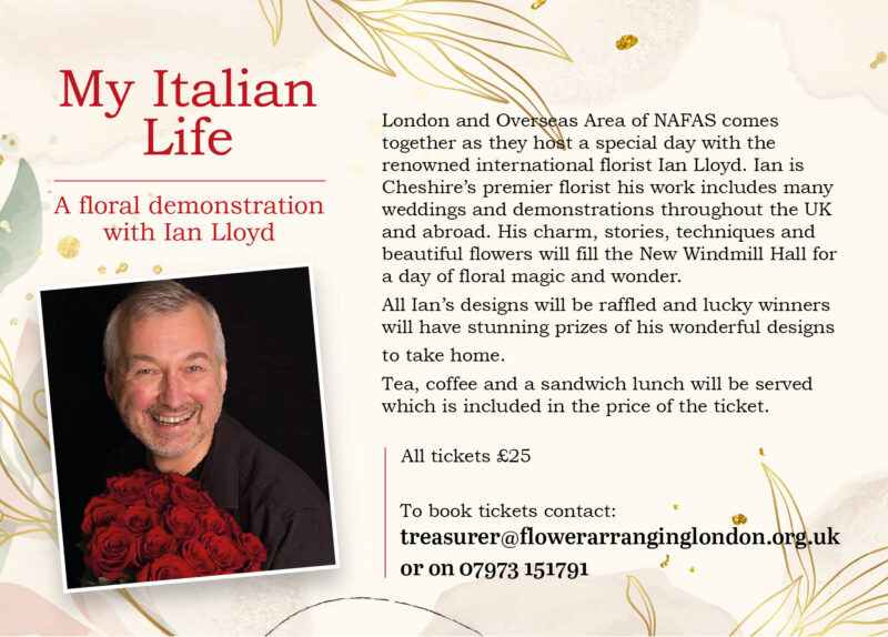 My Italian Life – A Floral Demonstration with Ian Lloyd Angela Woodley 29th March 2026 Event Details Date: 6th October 2026