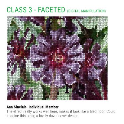 I thoroughly enjoyed judging this class. Some delightful work and inspired designs. An outstanding class of a very high standard with original and extremely innovative work. The use of texture and colour was exceptionally good. Some photography, especially placement and lighting, did not show all exhibits to their best advantage.