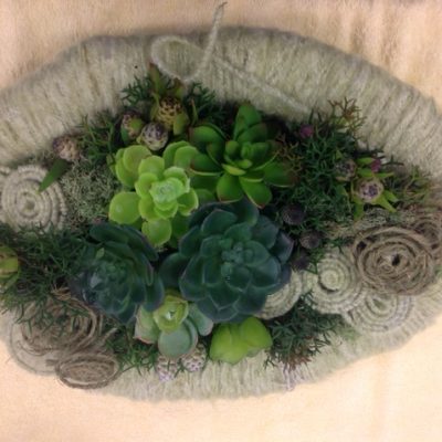 - Contemporary design using sisal structures to hold foliage covered bowl